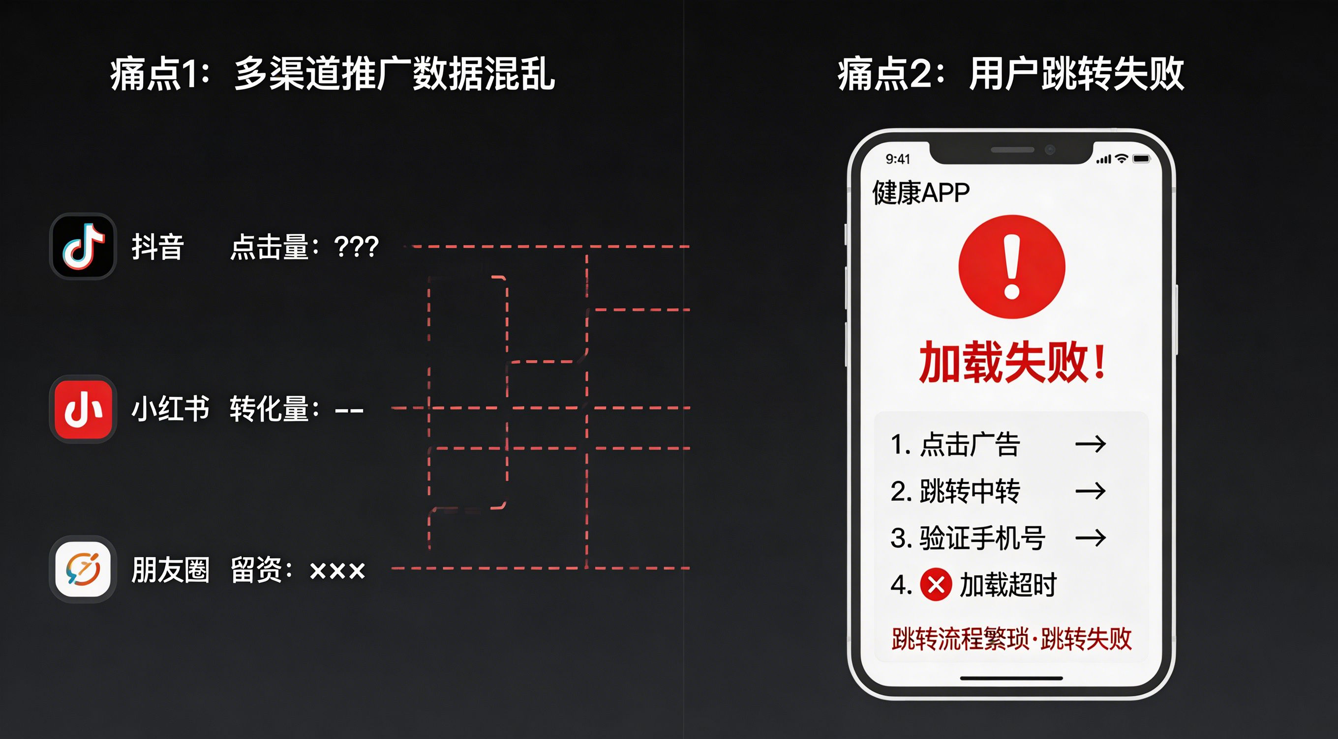 当下健康管理APP行业竞争日趋白热化,流量获客成本持续上涨,行业普遍面临双重运营瓶颈。一方面,多渠道推广数据割裂,传统统计方式难以精准追溯用户来源,渠道投放效果无法量化,虚假流量、数据失真问题频发,直接导致平台推广预算无端浪费,运营决策缺乏精准依据;另一方面,用户跳转体验存在严重断点,在社交分享、广告跳转等核心场景中,已安装用户无法直达目标页面,新用户下载后也无法匹配对应服务入口,繁琐的操作流程直接造成大量潜在用户流失。而想要解决这些痛点,离不开智能传参、一键拉起这类专业技术的支撑,这也成为健康类APP突破增长困境的核心需求。