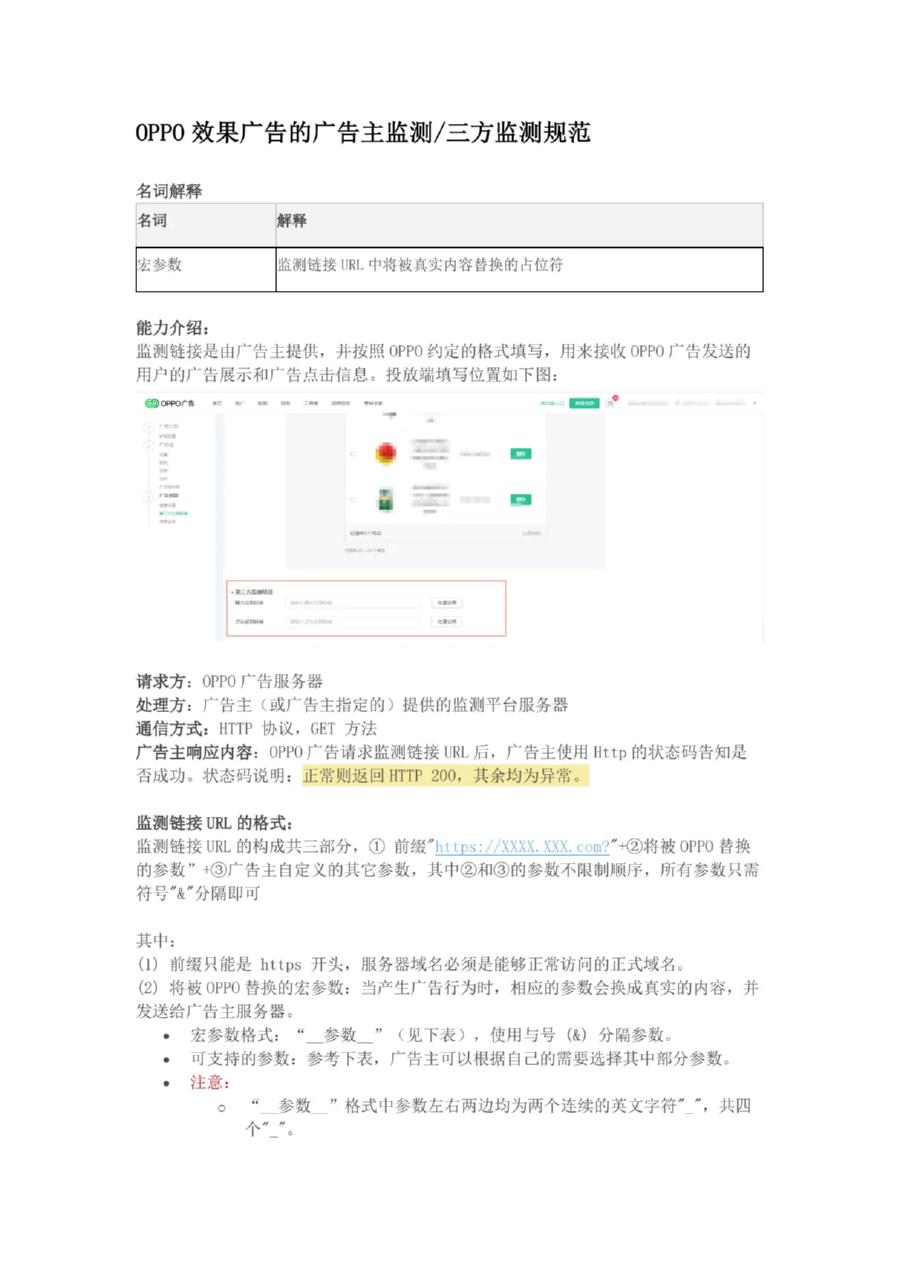 OPPO效果广告平台针对广告主监测链接进行了规范升级。此次更新主要影响广告主在投放端填写的展示/点击监测链接,涉及宏参数格式统一及OPPO商店渠道新增必填字段。规范明确要求所有增量监测链接必须采用