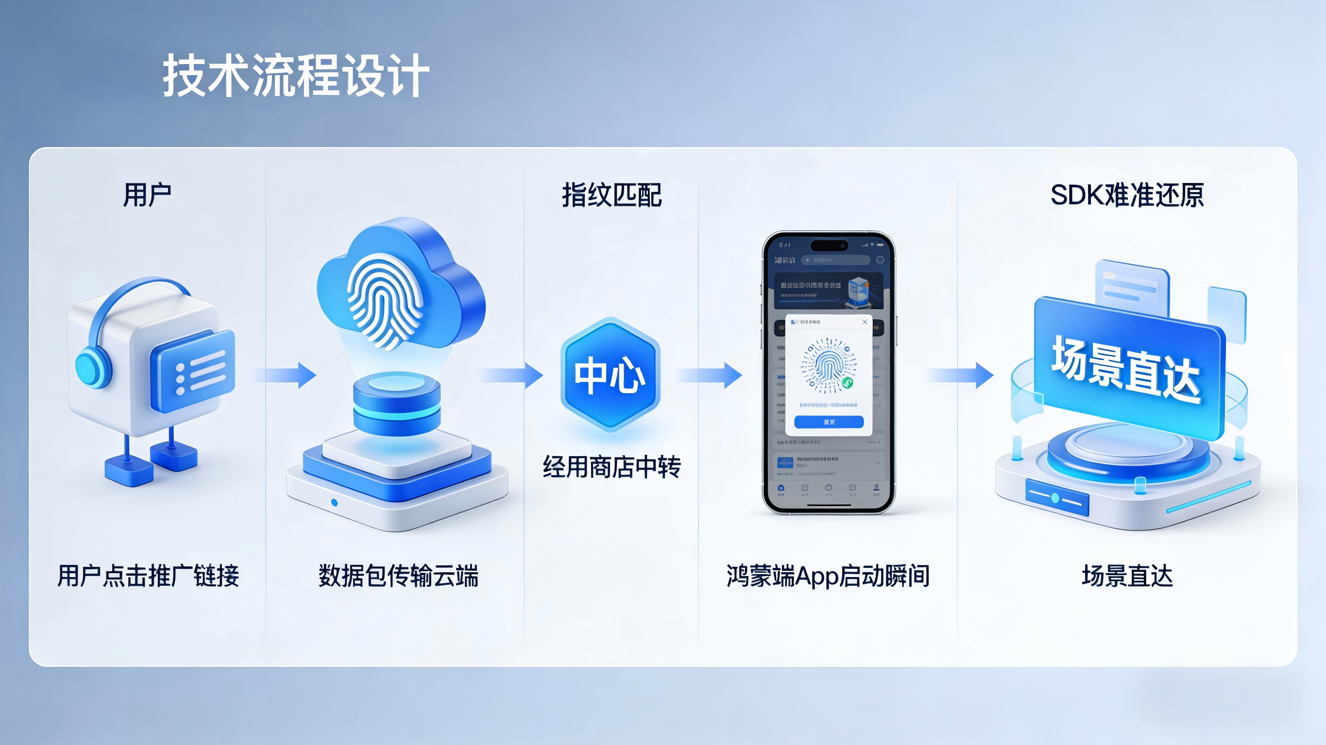 做法:利用独立于强设备硬件标识的App传参安装技术。当用户在外部端点击链接瞬间,服务端基于基础网络特征生成轻量级指纹并暂存携带的参数。当 App 在鸿蒙沙箱内被首次打开或热启动唤醒时,借助合规初始化的 SDK 在短时间内完成云端匹配,并触发回调重定向逻辑。