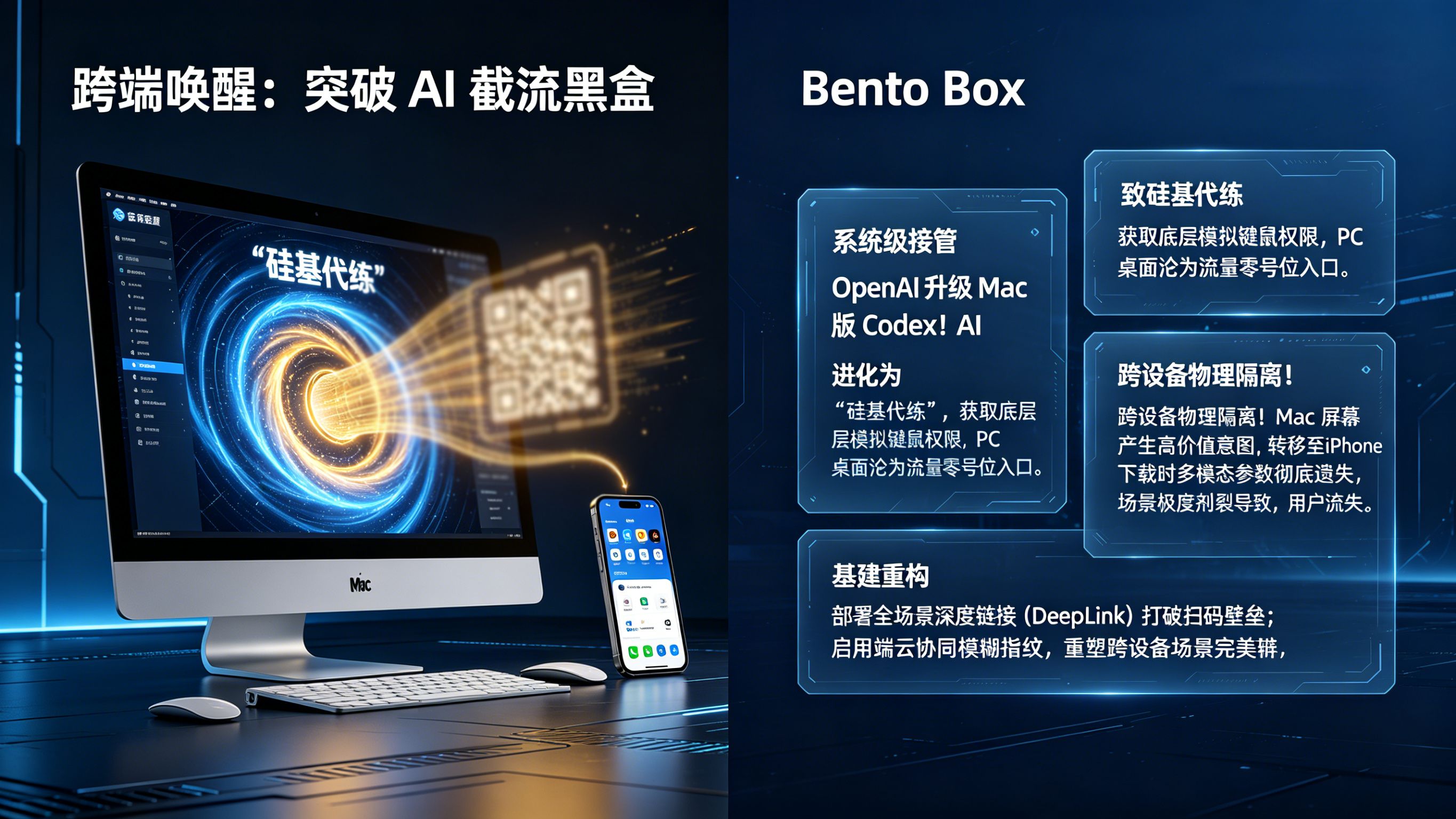 对于增长操盘手而言,必须极度敏锐地抓住“PC 端 AI 决策,移动端 App 承接”的新型跨端红利。不要试图去对抗大模型在 PC 端的全能接管,而是要顺应它:主动将自家的核心业务封装成极度标准化的引流卡片或 API,确保它们能被 Codex 这类超级 Agent 轻松抓取并在桌面端推荐。越早跑通“PC 端 AI 推荐 -> 移动端扫码传参 -> 手机端场景完美还原”的极致跨端闭环,就能越早在这一轮入口洗牌中,将高意图的桌面端极客用户,源源不断地洗入自家移动端的原生大盘。