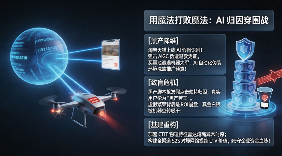 2026年4月23日,电商圈打响了“用魔法打败魔法”的底层攻防战第一枪。淘宝天猫上线AI假图识别模型,将矛头直指电商平台近年来极其猖獗的 AI P图骗取“仅退款”的黑灰产乱象。当普通买家或职业羊毛党可以用大模型一键生成逼真的“商品破损图”来白嫖高昂货款时,技术作恶的边际成本已经被彻底清零。电商平台的维权反击,只是这场由生成式 AI 引发的全球黑灰产降维打击的一个缩影。在移动互联网的另一个隐秘战场——App 渠道买量池中,利用 AI 批量生成虚假设备指纹、伪造点击与海量虚假激活的机器大军,正在疯狂洗劫开发者的拉新预算。面对高维度的 AI 机器流量,App 增长与风控团队究竟该如何重构底层的反作弊雷达与归因引擎,才能在真假难辨的数据迷雾中,死死守住企业的每一分资金血脉?