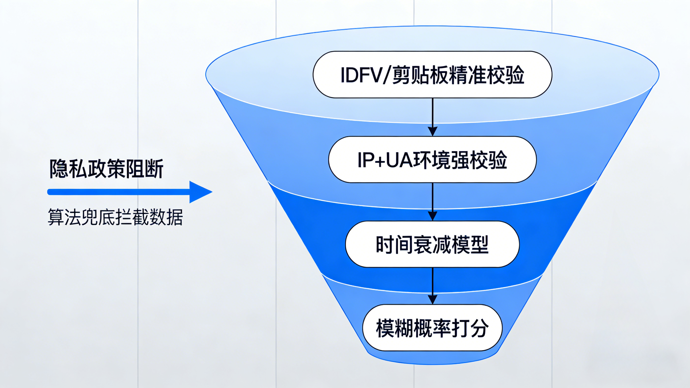 在 iOS 系统的生态中,由于苹果全面推行 ATT(App Tracking Transparency)隐私保护框架,IDFA(广告标识符)的合法获取率遭受重创,传统的单一精准归因逻辑已无法维系。为此,现代归因架构演进出了高度复杂的“级联补偿算法”作为坚实的降级兜底网。